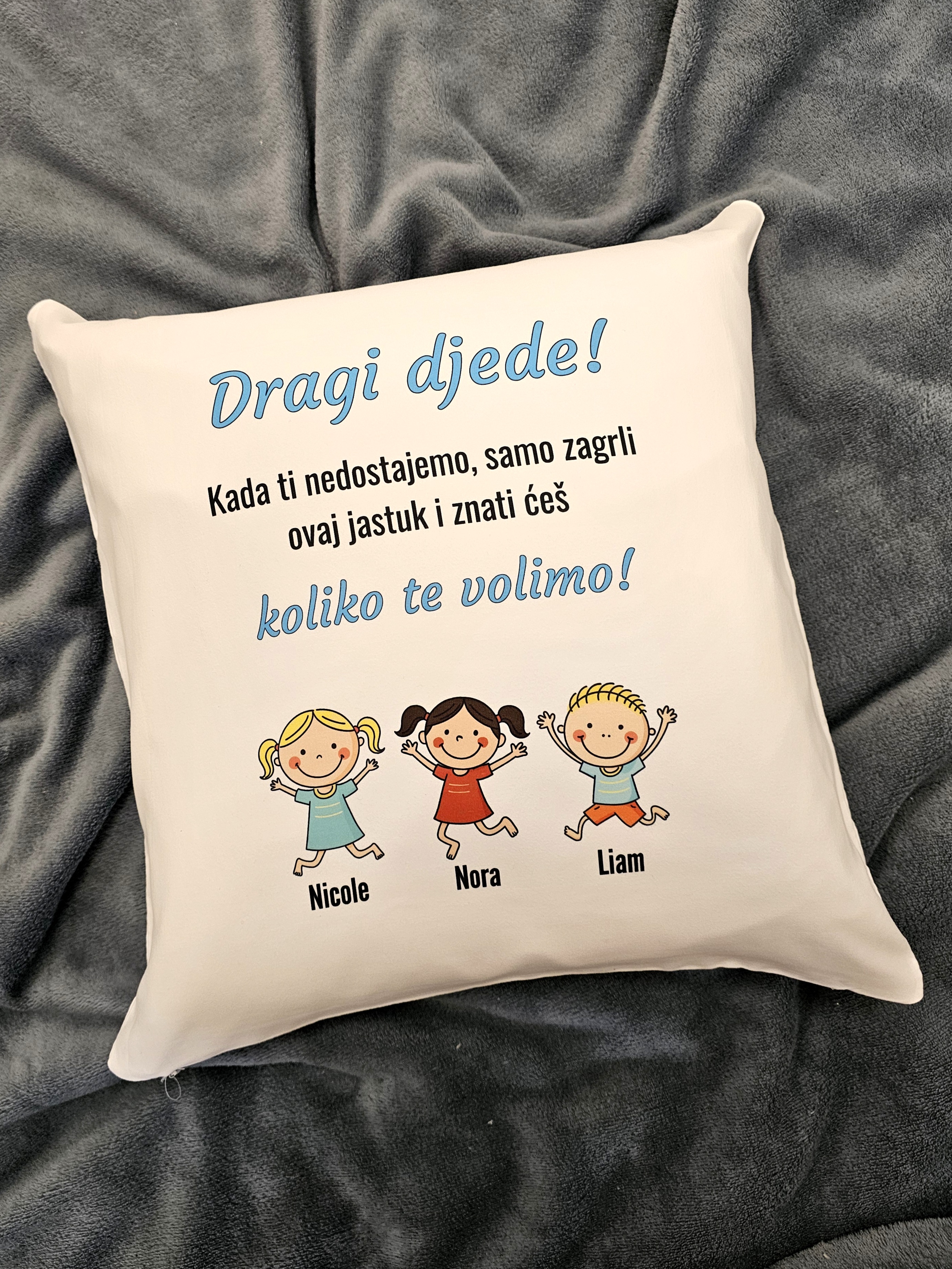 Personalizirani jastučić za djeda s crtanim likovima djece i porukom koja topi srce. Savršen poklon koji svaki dan podsjeća djeda koliko je voljen.