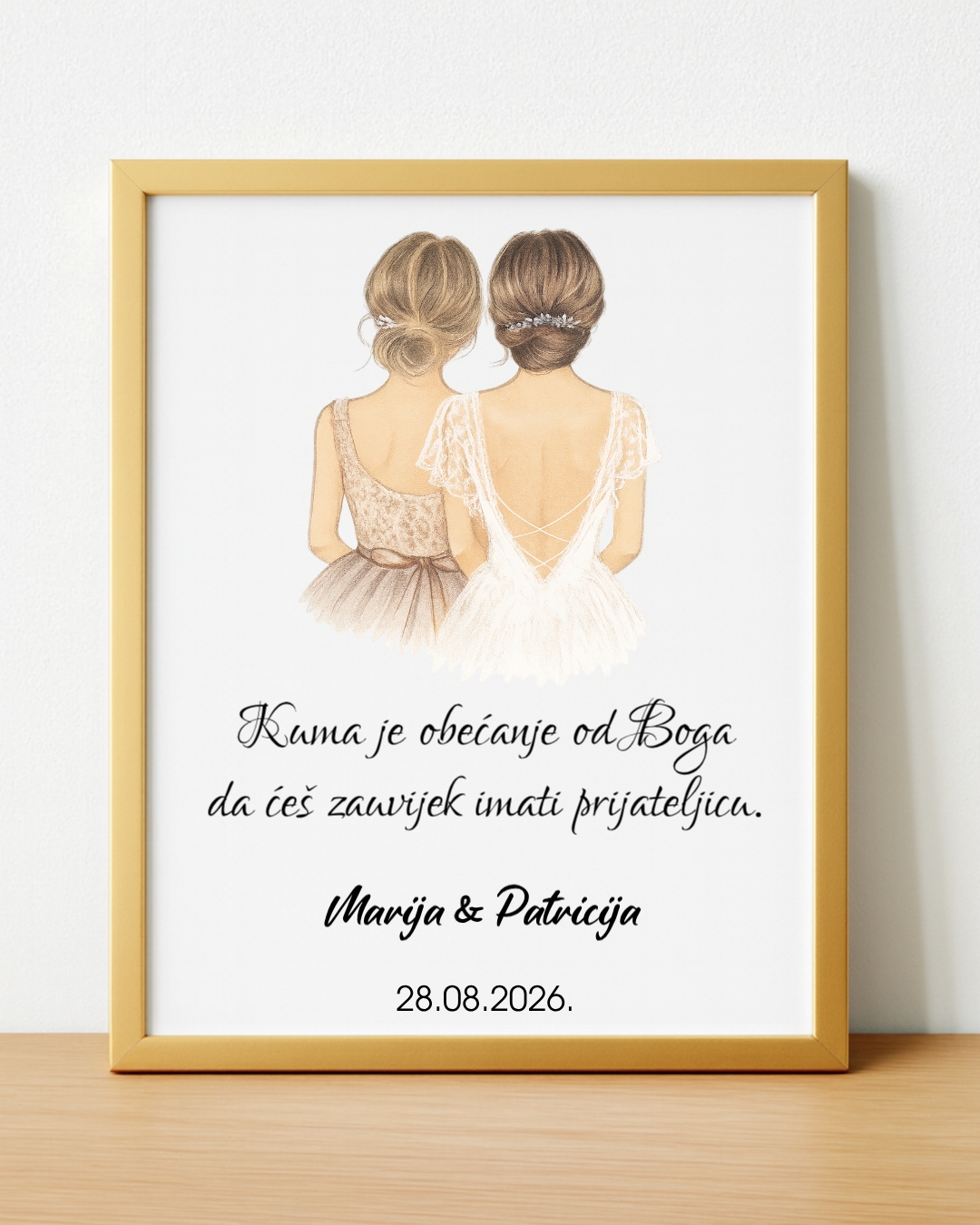 Personalizirani poklon za kumu – okvir s ilustracijom mladenke i kume.