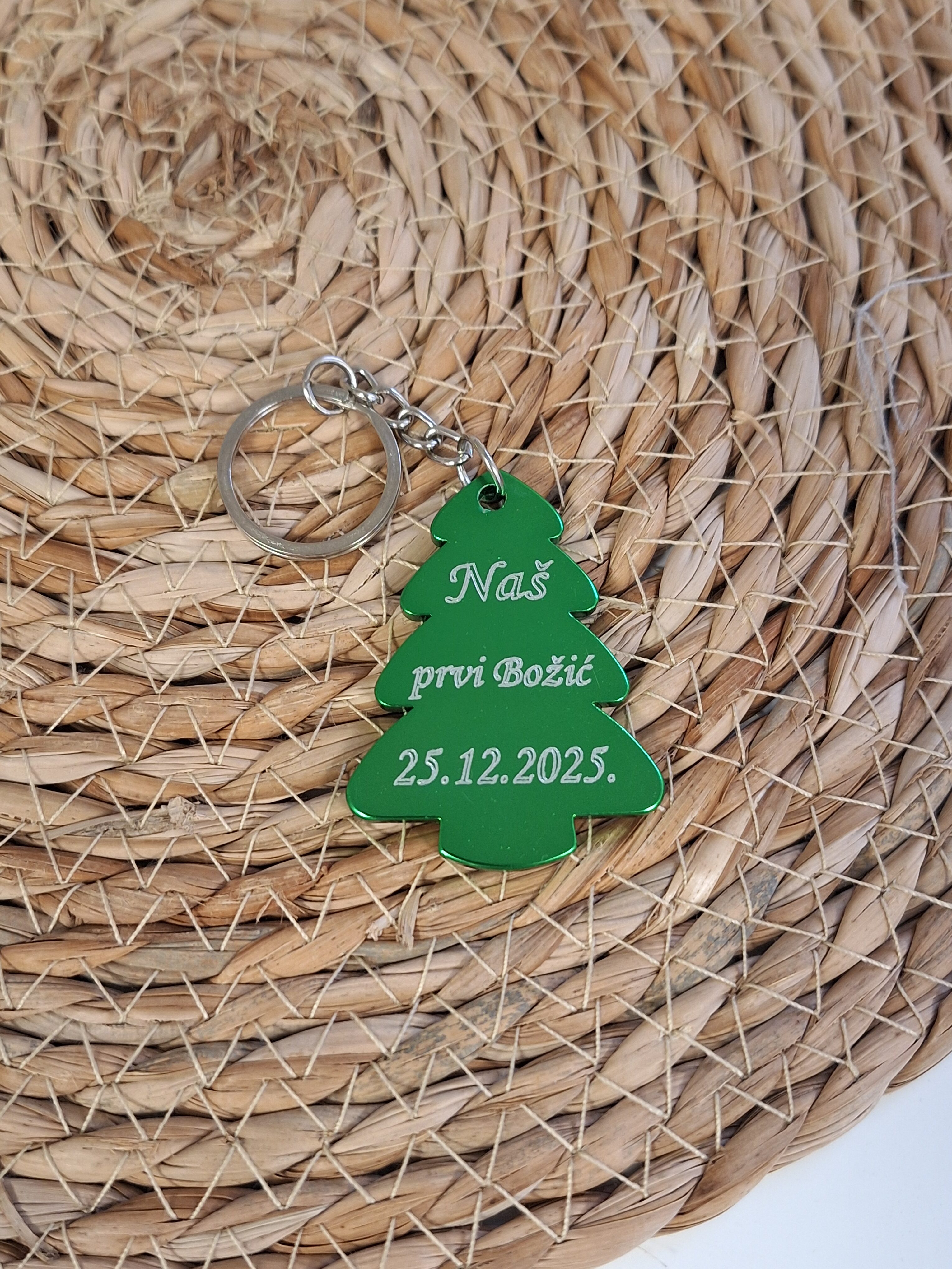 Privjesak za ključeve u obliku božićnog bora, izrađen od kvalitetnog metala s precizno ugraviranim natpisom. Idealan je kao uspomena na prvi Božić ili poseban poklon dragoj osobi. Personalizirani tekst i datum daju mu jedinstvenu, emotivnu vrijednost dok praktičan dizajn omogućuje svakodnevnu upotrebu.